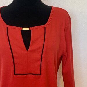 Ellen Tracy tunic top SZ LG Red ¾ sleeve blouse with keyhole neckline Cotton
