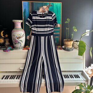 Ellen Weaver Elegant Navy and White Striped Jumpsuit M