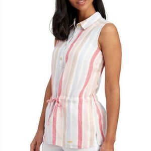 Ellen Tracy 100% LINEN striped sleeveless half button down drawstring waist top
