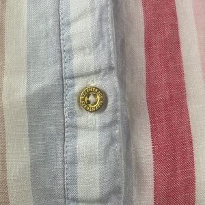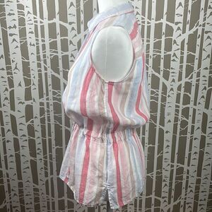 Ellen Tracy 100% LINEN striped sleeveless half button down drawstring waist top. Pretty muted color vertical stripes in nude, pink, red, blues. Shiny gold buttons and logo plate, thick elastic waistband in back. Such a beautiful quality piece! Worn once and laundered with no flaws to note but it does have the nubby texture that is a characteristic of linen (see last pic). See pics for measurements. A super breathable natural fiber piece and a great closet staple!