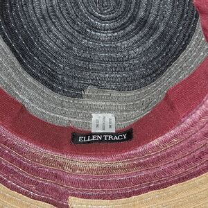 This is a beautiful hat and has a 5-inch wide brim. Protects from the sun or just add a nice look to your outfit. There are rings of colors and a gold name plate. Just enough gold shimmer. Worn one time. Excellent damage free condition.
