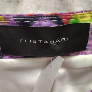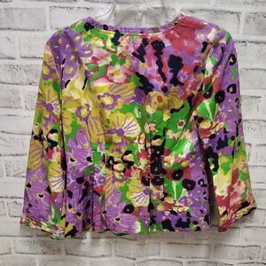 This Ellen Tracy blazer showcases a bold graphic design in vibrant green and purple, offering a boxy silhouette with 3/4 sleeves. Ideal for making a statement, this piece combines modern style with a touch of artistic flair.