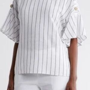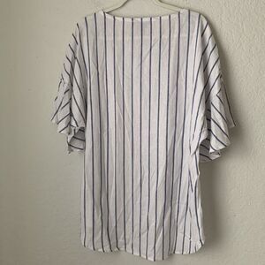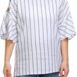 This Ellen Tracy blouse features a classic white base with subtle blue stripes, offering a relaxed and boxy fit. The short sleeves and lightweight fabric make it perfect for a casual yet stylish look, ideal for any occasion.