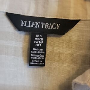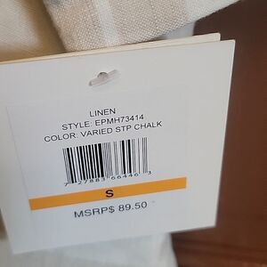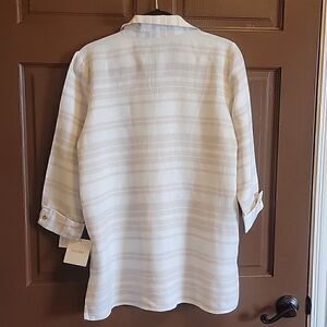 Ellen Tracy-Linen beige/white striped collared top with v-neck. Small. NWT.