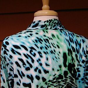 Greens, aqua blues and blacks create this animal print cardigan. Shirring at wrists of sleeves . Pleated collar band. Open front. Size M measures 40 at chest, 44 at bottom hem, 24.5 from shoulder to hem. A perfect finish.