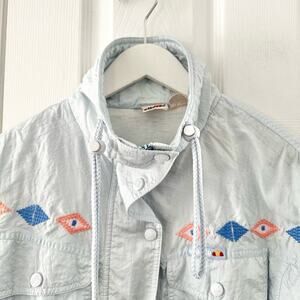 Size medium from Ellesse. Vintage. Light shimmer blue windbreaker full zip jacket with blue and orange red embroidered southwestern style diamond pattern. Lined interior. Trucker style with two snap button flap chest pockets. Snap button closure. High neckline with drawstring. Banded stretch bottom. Preowned in good condition with no stains or tears.