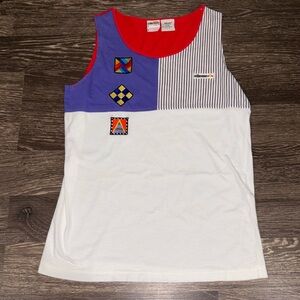 Ellesse vintage tank top with purple and red design. Tag says size 2, see measurements in photos. One spot on the back of the shirt noted pictures.