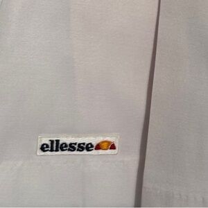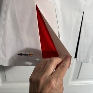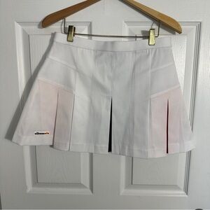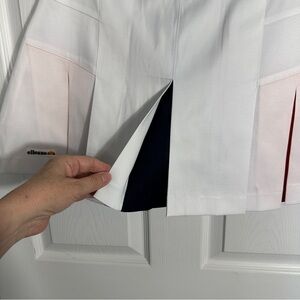 Vintage Ellesse pleated tennis skirt in size 12. White with red and blue panels inside the front pleats. 1990s. Elastic waist, back zip. 78% Dacron polyester/15% cotton/6% lycra. Mini length. Super cool vintage piece!