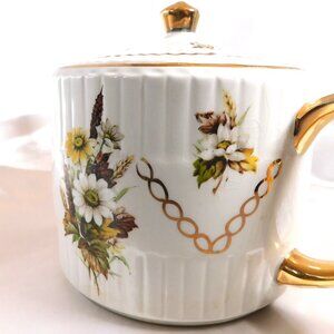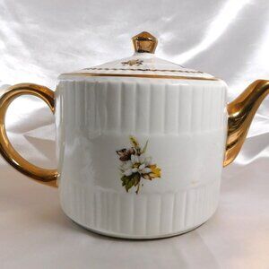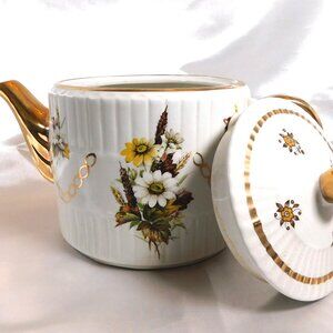 This is a white Ellgreave & Wood and Sons teapot with a white and yellow flower design with gold trm. Ellgreave is a Wood and Sons Company. The teapot has a ridged shape with a gold spout and handle and gold trim.