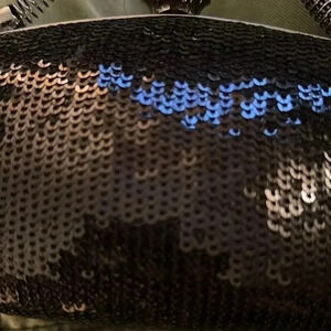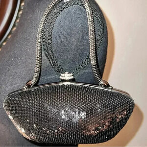 Ellian black sequin evening bag purse with brushed silver spring handle (shoulder chain not available), silver tone frame, and rhinestone accent closure in EXCELLENT condition! No holes, stains, or missing sequins. Purchased at Nordstrom. ***Pls see all photos as they are part of the description**SALE***