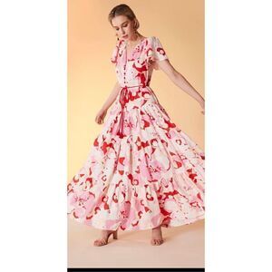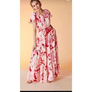Removable tie belt Missing !!!!!From the Afterglow Collection. This linen maxi dress is adorned with a vibrant floral print with a tie belt.