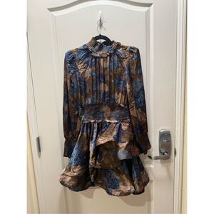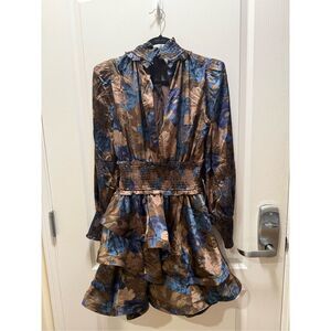 This stunning Elliatt dress showcases a fit and flare silhouette with a peplum detail at the waist, perfect for cocktail events. The long bishop sleeves and mock neck add a touch of elegance, while the blue and brown color palette ensures a sophisticated look. Ideal for a night out, this dress combines modern style with classic charm.