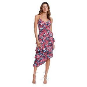 Elliatt Byron Asymmetrical Hem Midi Floral Dress in Multi Pink L