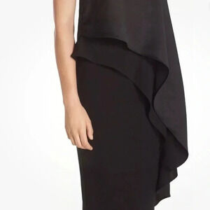 Asymmetrical proportions provide a refreshing silhouette for a contemporary evening dress that pairs a stretchy ponte-knit base with a flowy ruffled overlay of silky satin crepe.