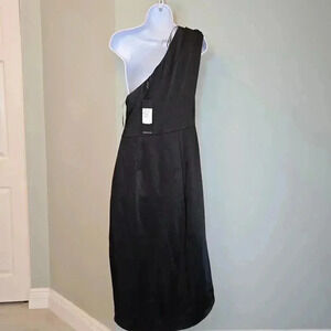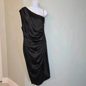 NWT Elliatt Cassini Sheath Dress Ruched Side One Shoulder Satin Black Womens L