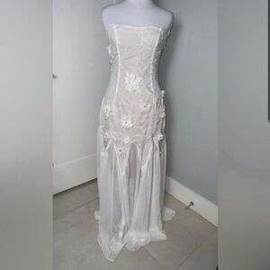 Tags: white strapless gown, floral applique dress, chiffon formal gown, ethereal white dress, romantic evening gown, bridal shower dress, rehearsal dinner look, boho wedding dress, white maxi dress, garden party outfit, flowy chiffon gown, modern bride style, off shoulder formal dress, luxury event wear, elegant long dress, feminine formalwear, delicate floral details, statement evening gown, timeless white dress, special occasion fashion