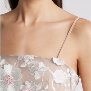 Elegant lace overlay with floral accents. Perfect for special occasions.