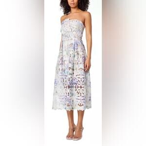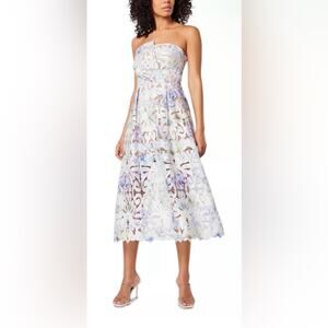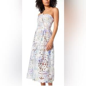 Embrace a dreamy, boho vibe with this strapless tie-dye midi dress, splashed in cool hues for a fresh, effortless look. Falling to a chic midi length, this dress fits true to size and offers a flattering silhouette, perfect for any warm-weather occasion. The asymmetrical neckline adds a modern twist, while the back zip closure ensures a seamless fit. Featuring an allover printed floral lace design, this dress is crafted from 100% polyester with a fully lined interior for comfort. Measuring approximately 42.75" from shoulder to hem, it perfectly blends laid-back style and sophisticated detail. NWT (New With Tags) for added appeal. Dry clean only.