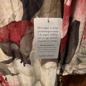 Elliatt Upstage Floral Maxi Shirtdress in navy. Front button closure, spread collar. 3/4 length sleeves. Removable belt. Partially lined. Women's size large. New with tags, but missing the matching belt.
