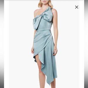 ELLIATT VAUDEVILLE BLUE SATIN OVERSIZED BOW DETAIL ASYMMETRICAL ONE SHOULDER DRESS