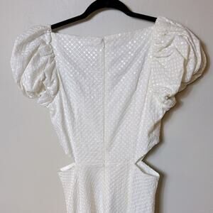Elegant white midi dress. Features puff sleeves and side cutouts. Perfect for any occasion.