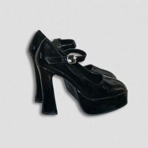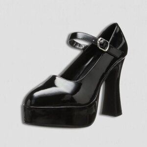 Step into bold retro fashion with these Ellie black patent Mary Jane heels. Featuring a shiny vegan leather upper, chunky platform, and a secure strap design, these heels are perfect for vintage-inspired looks, cosplay, or nights out.