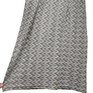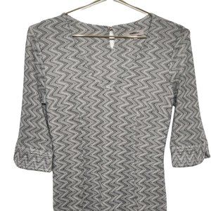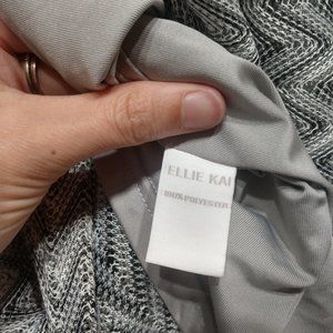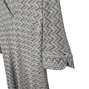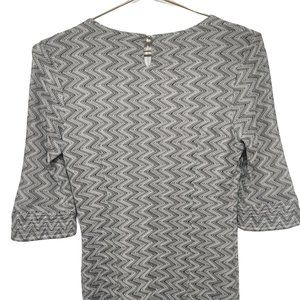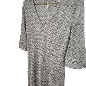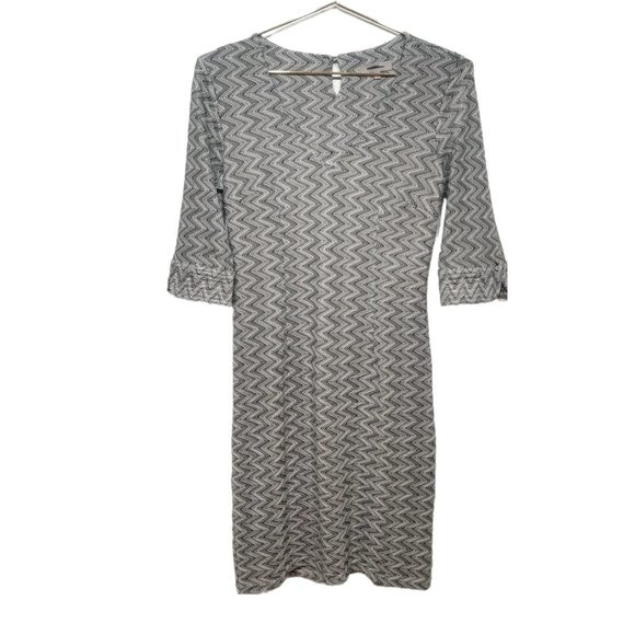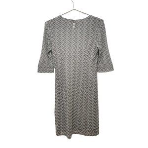 This dress from Ellie Kai in gray, has allover chevron / zig zag pattern, knit fabric, lined, v-neck, 3/4 sleeves, and silvertone button for back closure. Lovely high quality dress.