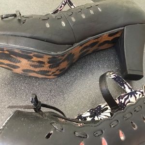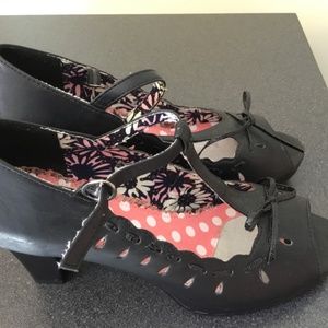 These a brand new never worn pair of Ellie shoes for Bettie Page peep toe shoes. I don’t have the box on this pair. Sorry, they were from NYC store. They are man made material and look great with a retro dress for sure. Size 9 M. Platform so very easy to wear