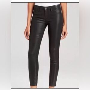 Edgy lux denim with a faux leather look. Stretchy. Waist 14.5, rise 9.5, inseam 28”. Like new. Questions? Leave a comment below!