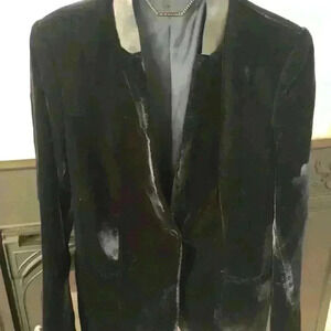 Gorgeous midnight blue velvet jacket. Fully lined with faux black leather mandarin color. 2 pockets with snap closure. Approximate measurements pit to pit 21” and shoulder to hem 28”. Padded shoulders add definition to this fab jacket 😍. Purchased from Bloomingdales and worn once