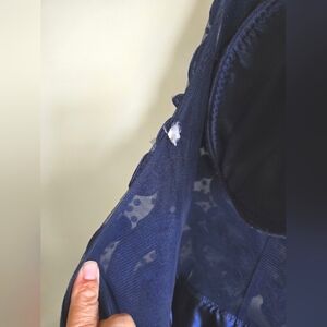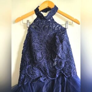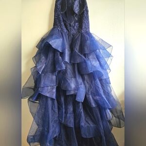 Make and entrance in this beautiful lace and tulle ball gown in a beautiful navy tone blue. Perfect for prom, gala, military ball or even holiday!