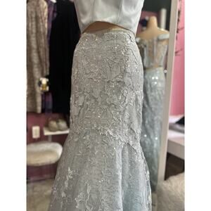 Beautiful prom formal dress by Ellie Wilde by Mon Cheri. Light blue. 2 pc set with cropped bustier top and skirt. Top has padded cups. Floral print lace with sequins for shimmer. Zipper closure. Polyester.