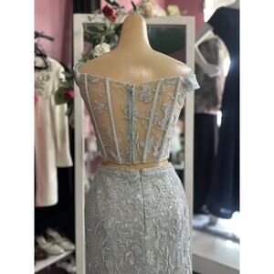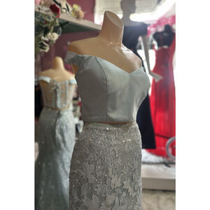 Ellie Wilde by Mon Cheri 2 pc Prom Dress Set Cropped Blue Lace Shimmer M