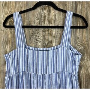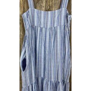 Elliot Lauren Midi Dress L Blue/White Stripe Sleeveless Tiered Ruffled Chambray.