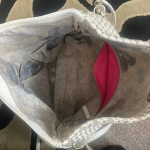 Elliot Lucca leather woven clutch evening bag. Strap is detachable & versatile & can be used as a long crossbody, short crossbody, shoulder bag, or clutch.