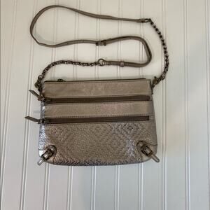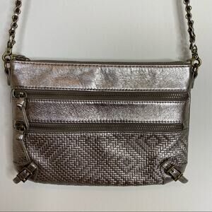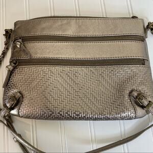 Elliot Lucca Messina silver metallic pewter leather 3 zip crossbody bag purse