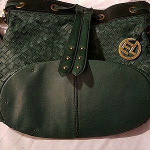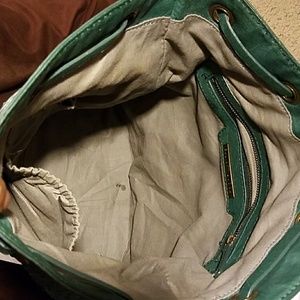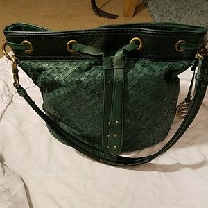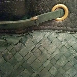 Teal Green basket weave bucket shoulder strap purse. It has a brass rings and a leather pulls string. Pull strong does have a small separation on back of the purse (see picture.) One large pocket inside on the back and two small on the front of the inside the bag. 2 spots inside small (see picture), gently used , still has a lot of life in her.