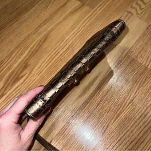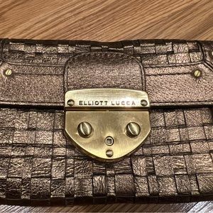 Gently loved Elliot Lucca metallic bronze Woven Leather with brushed gold hardware Wristlet Wallet. Good condition overall but see last photo for black rub mark on interior.