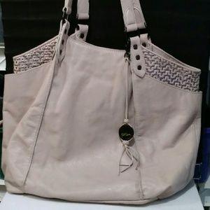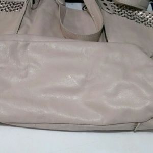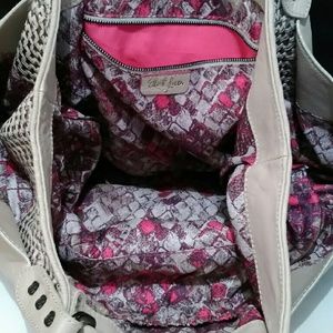 Beautiful large Hobo style handbag. White leather shell w/multi color faux scale pattern. The lining is polyester and has one zipper and two open pockets. The shell also has two very large pockets on either side. The outer pockets tapper from 10 1/2" at the top to 5 1/2" at the bottom...