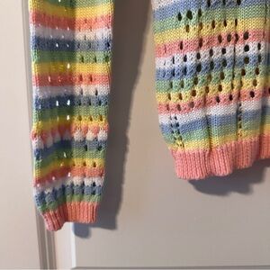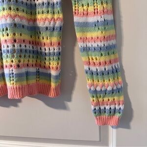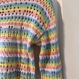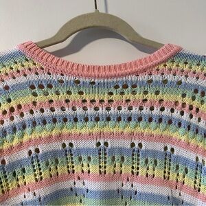 Colorful pastel striped knit sweater with open knit detailing through and contrast pink neckline, hem, and cuffs. Comfy, cute, and lightweight. Pre-owned in excellent condition, no holes or stains.