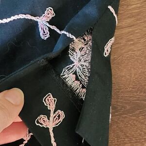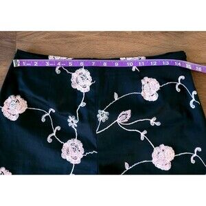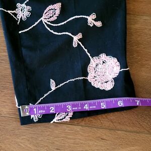 Great pre-owned condition. Black ankle pants with ankle side slits and beautiful pink embroidery flowers with a white outline. Pic lighting washes out the pink color. Its like a barbie cotton candy color. Side zipper. See pics for approx measurements and details.