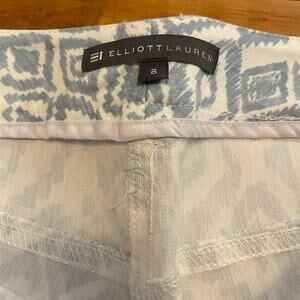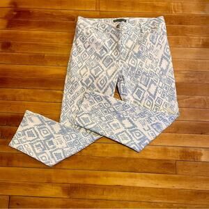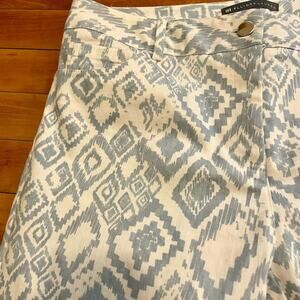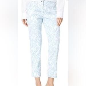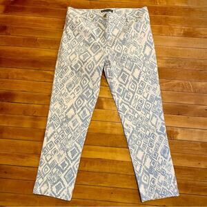 Size 8. 26” inseam, 36” from hip to bottom. Cropped fit. White and light blue ikat pattern. 5 Pocket style. Button/zip fly closure. Lightweight cotton/poly blend.