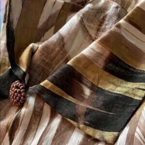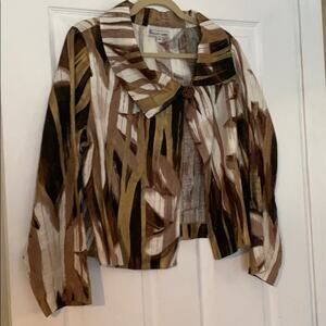 Elliott Lauren jacket. This jacket is absolutely stunning. Does not have a tag to show fabric content I believe it to be linen. Certain areas look almost metallic maybe even painted. Very unique piece. Lovely button. Like new.