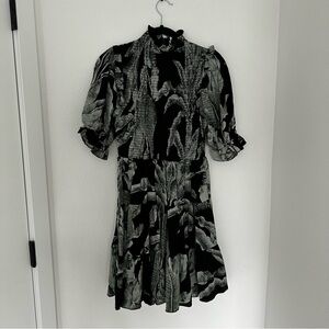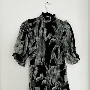 Elliott Los Smocked Mini Dress Mock Neck Black Palm Print Size Small Women’s