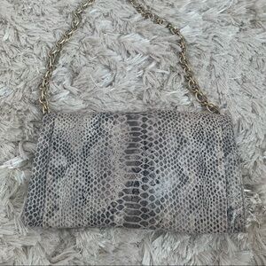 Elliott Lucca Cordoba Clutch Cordoba Clutch Exotic* 11.25"L x 1"W x 7"H, Drop: 13" Exterior: Leather Interior: Polyester Black/White color and gold tone hardware Flap with turnlock closure Strap is removable; can be worn as a shoulder bag or a clutch Lining features two multi function pockets and a zippered backwall pocket