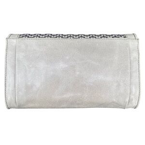 Beautiful bone colored bag with bone and silver weaving on the front, and black detail. Detachable straps. Vibrant material in the lining. Like new condition.