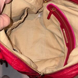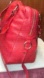 Red and pink leather trimmed zipper pocket/metal Designer nameplate below