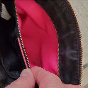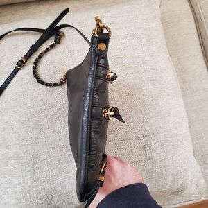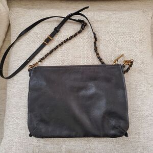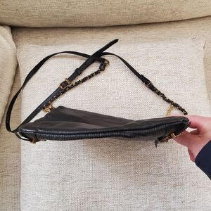 Genuine leather. Dark Gold tone hardware. Detachable cross body strap. Approx size: 10" Wide x 7" High x 1" Deep.