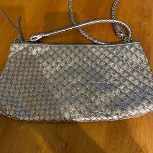 Elliott Lucca silver leather braided handbag with a zipper closure. It has a long cross body strap and measures 12 x 6.5. The inside is very clean with a zipper pocket and a small pocket too. In excellent condition.