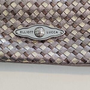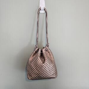 Elliott Lucca Silver Metallic Leather Woven Drawstring Bucket Purse